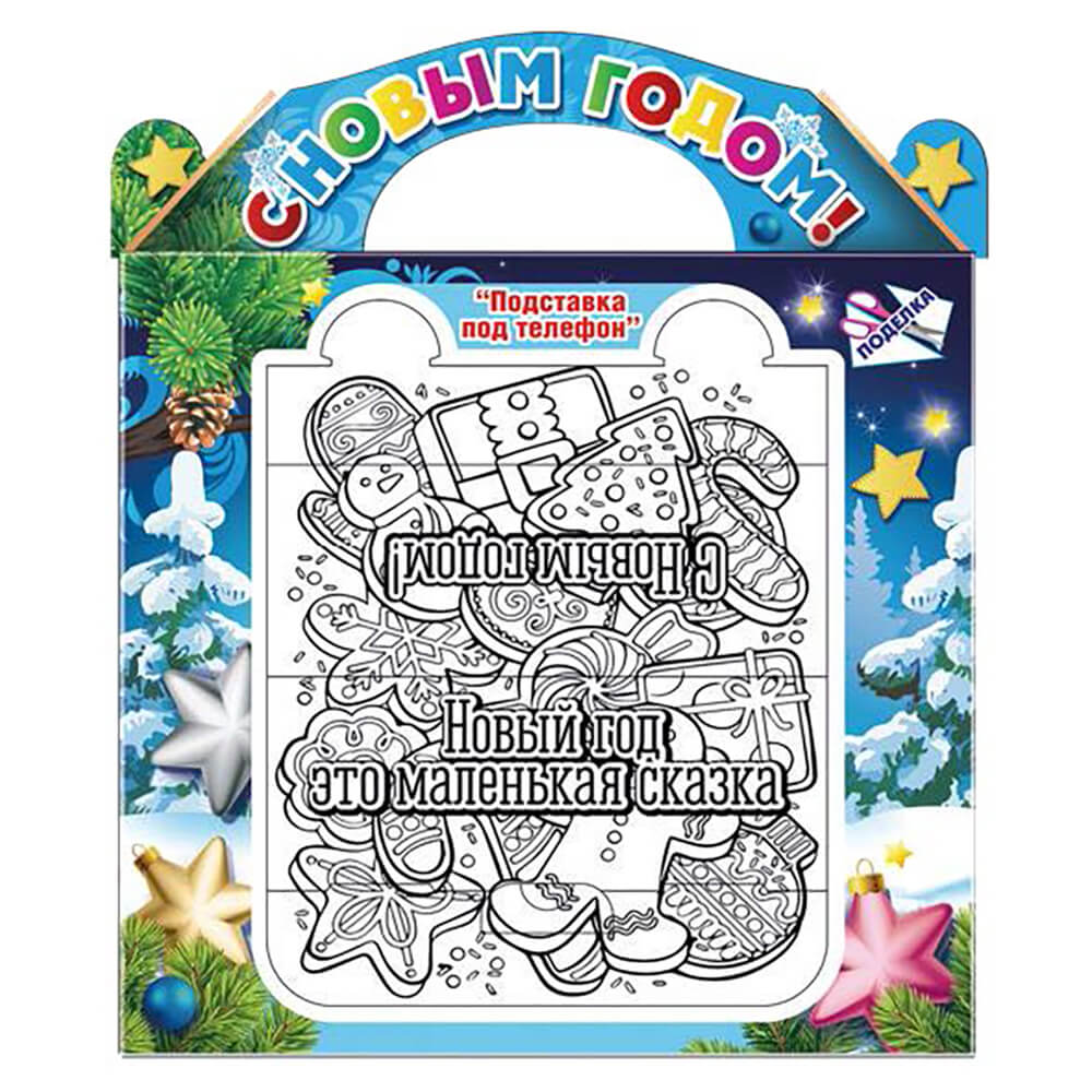 Коробка сундучок со сказочным новогодним сюжетом, на обратной стороне — макет поделки «подставка под телефон».