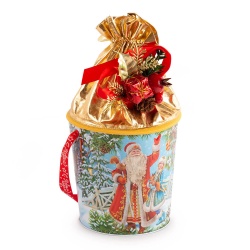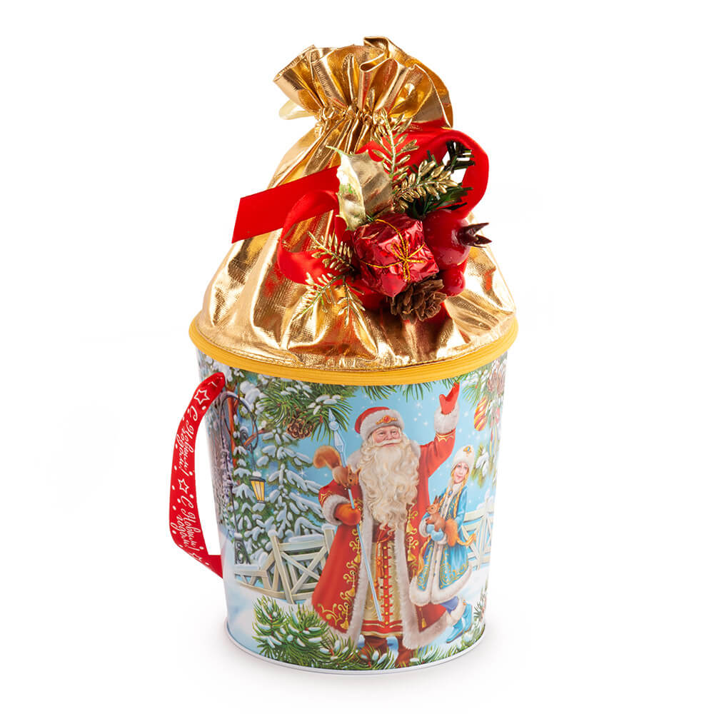 Расписная часть подарка «Как в сказке» сделана из жести, в форме ведерка. Верхняя часть выполнена из золотистой ткани, которая стягивается ленточкой. У подарка есть ручка из красной атласной ленты с праздничной надписью.