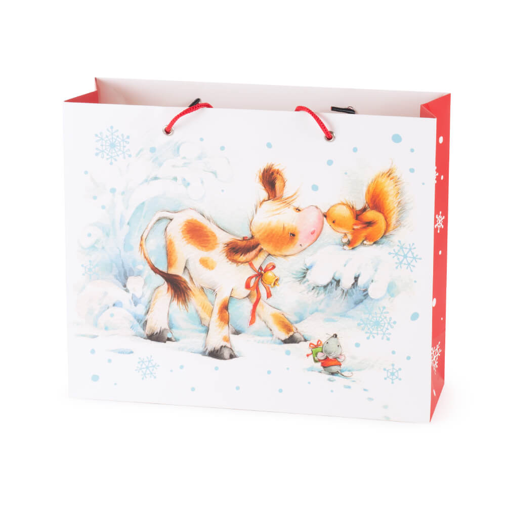 Подарочный пакет с ручками с изображением молодого бычка в заснеженном лесу.