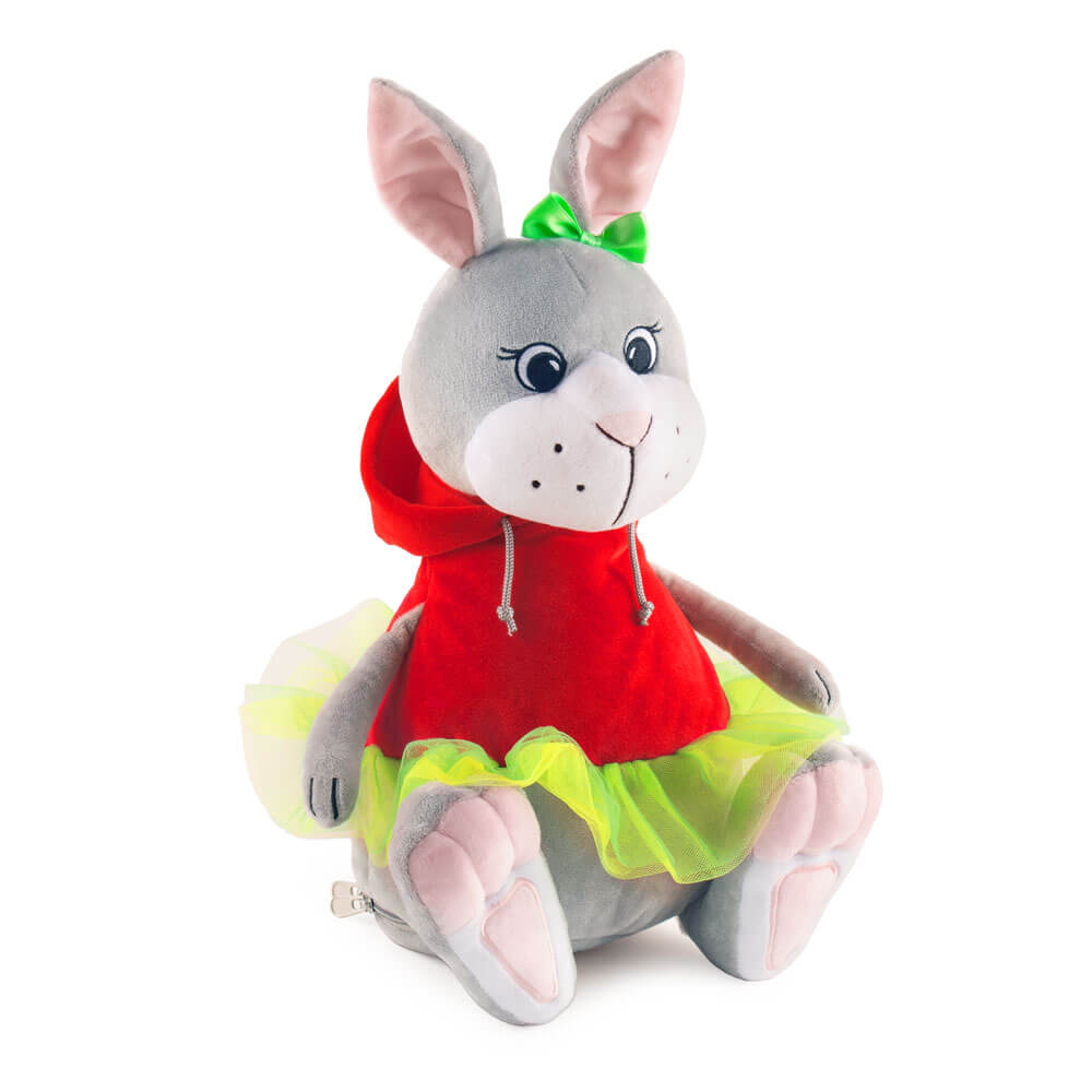 Текстильная упаковка игрушка зайка Оливия в красной толстовке с юбочкой.